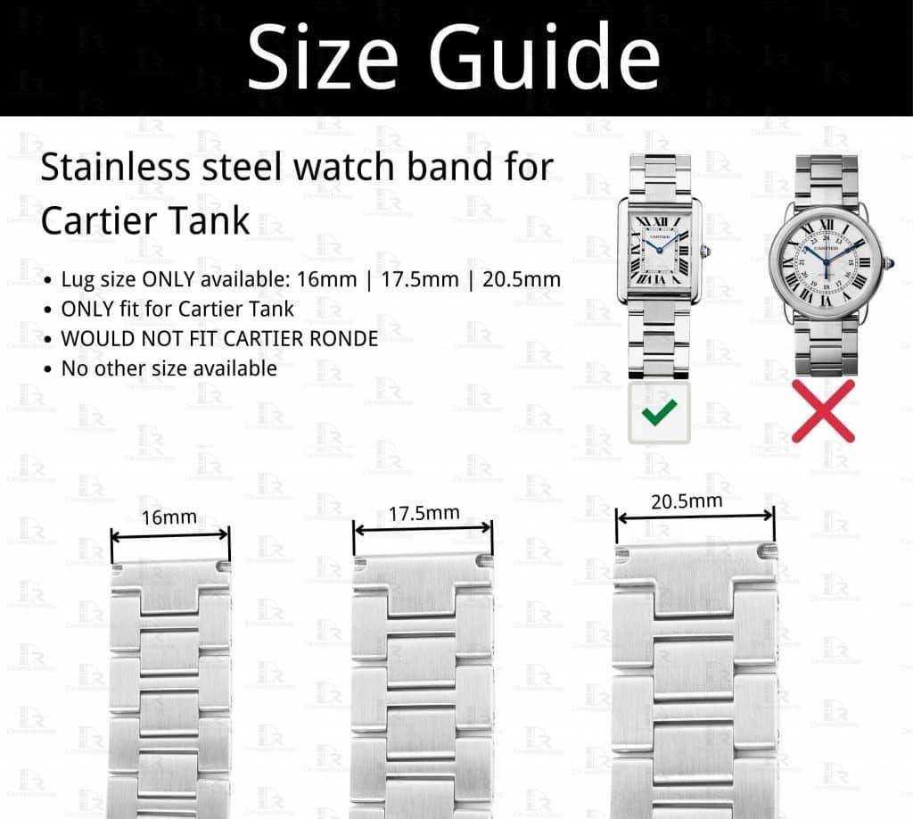 | Lug size for Cartier Tank | 16mm, 17.5mm, 20.5mm |