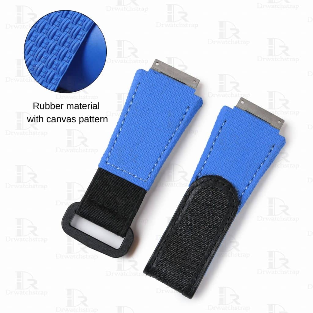 Personally, I like rubber material better. I prefer rubber to canvas. It looks like canvas, but when you feel it you know it is rubber. The canvas pattern rubber straps for Richard Mille RM are made from PVC rubber, printed (embossed) with a canvas pattern that is highly resistant to chemicals, heat, and stains and has no scent. It’s hard-wearing and waterproof, which makes the straps perfect for the Richard Mille luxury watches. Fully wrapped edge to ensure the watchband looks as good as it is tough.