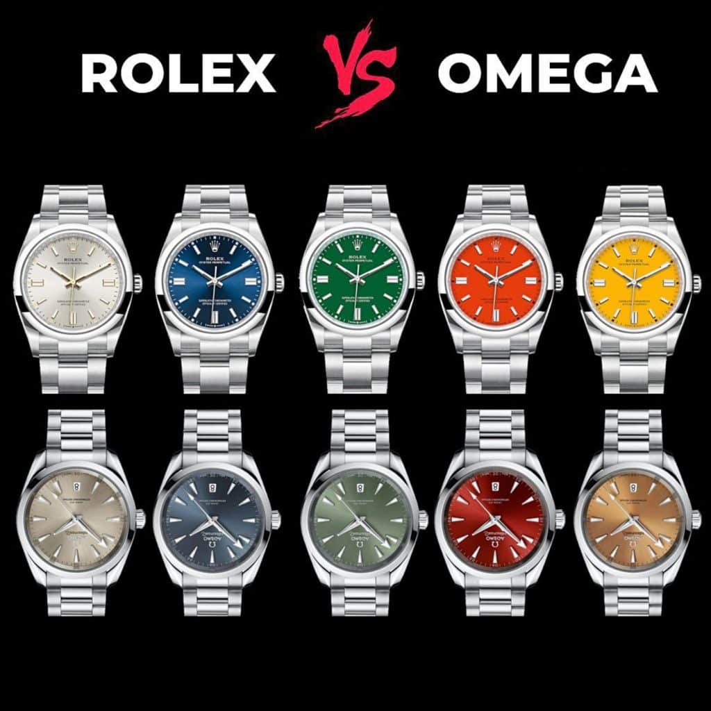 Omega Aqua Terra vs Rolex Oyster Perpetual orange colorful dial Omega Aqua Terra vs Rolex Oyster Perpetual blue colorful dial Omega Aqua Terra vs Rolex Oyster Perpetual gray colorful dial Omega Aqua Terra vs Rolex Oyster Perpetual yellow colorful dial Omega Aqua Terra vs Rolex Oyster Perpetual green colorful dial
